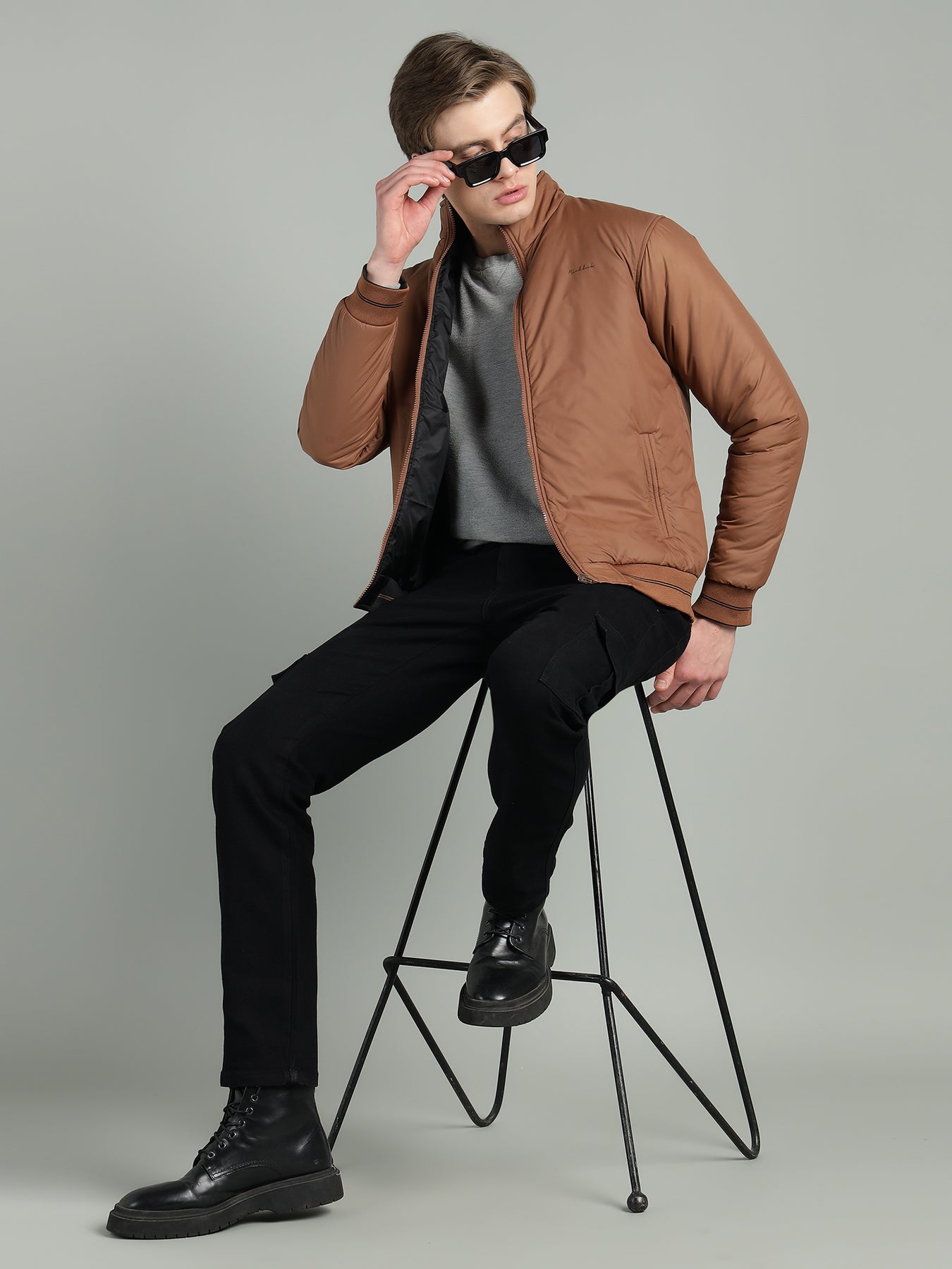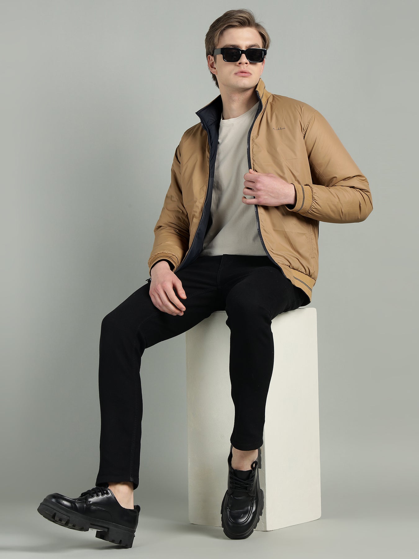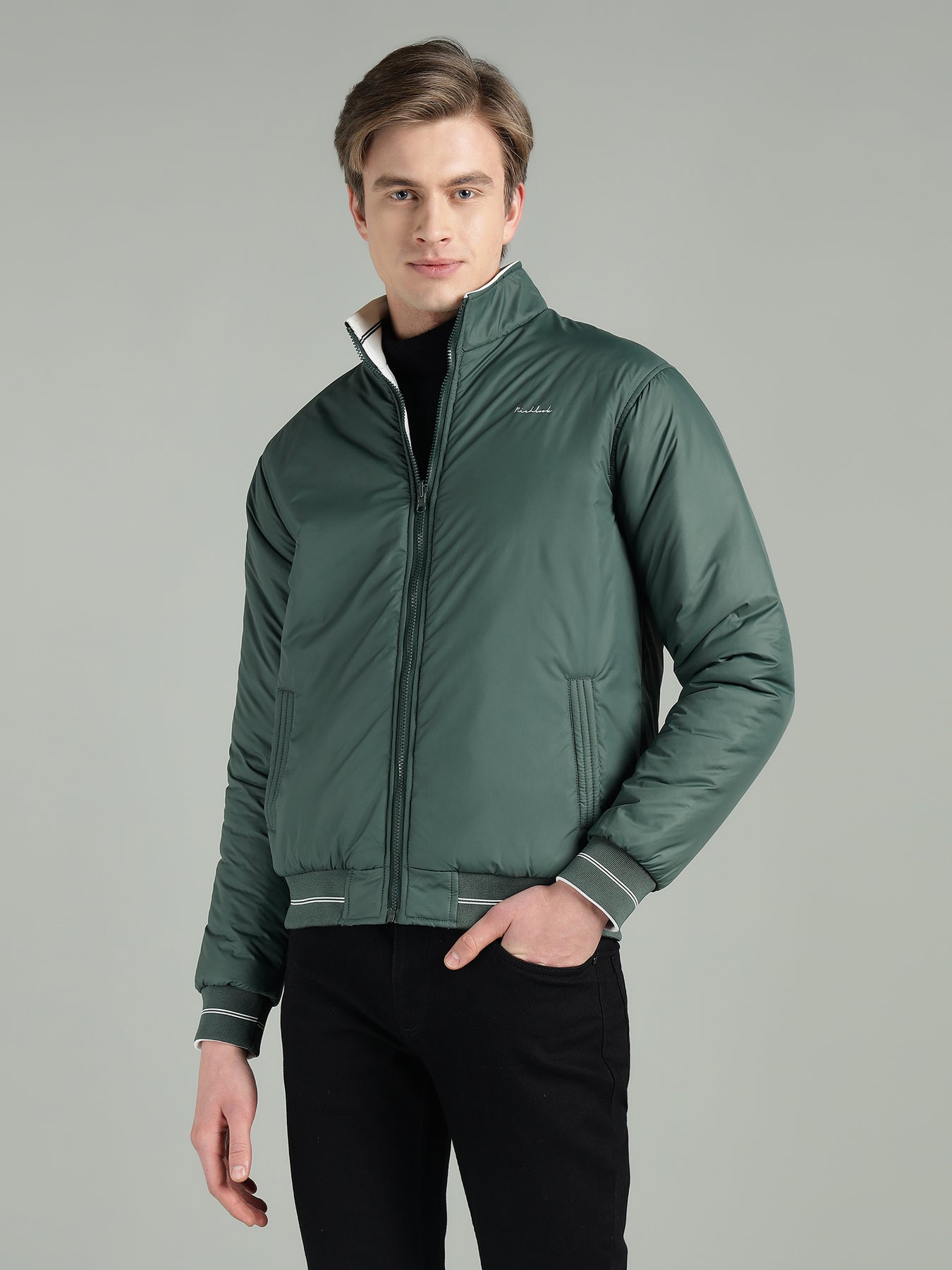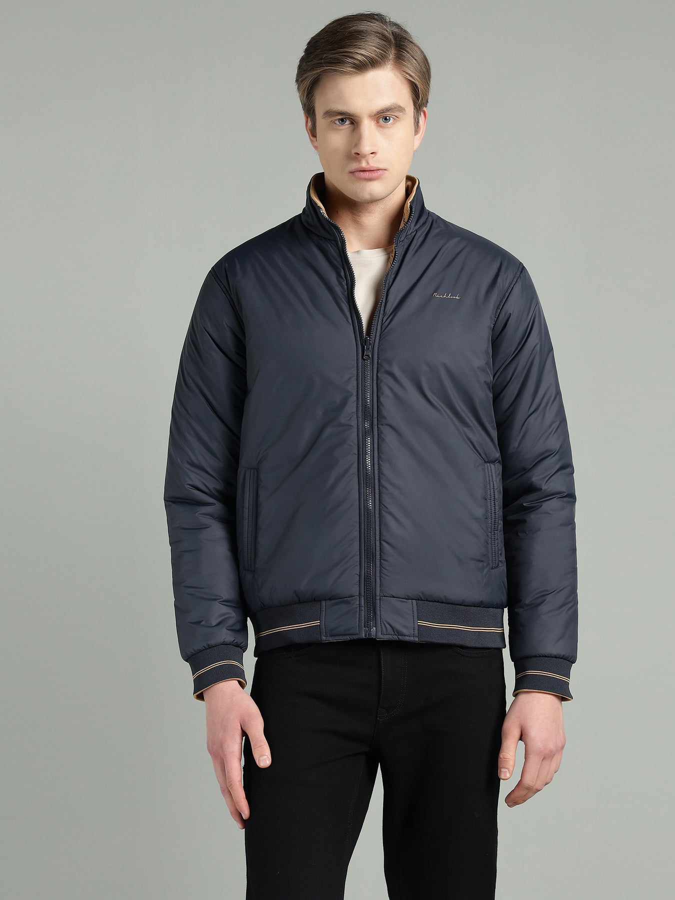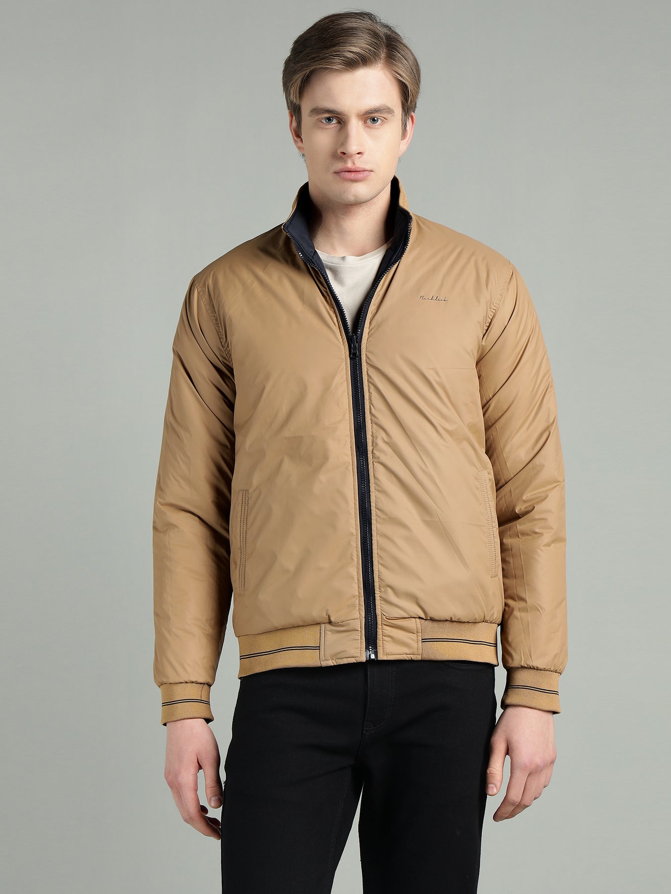 The reversible design gives you two distinct looks in one jacket—perfect for switching styles effortlessly. Featuring a stand collar, smooth zip closure, and ribbed cuffs and hem, it ensures a snug fit while maintaining a clean, modern silhouette.