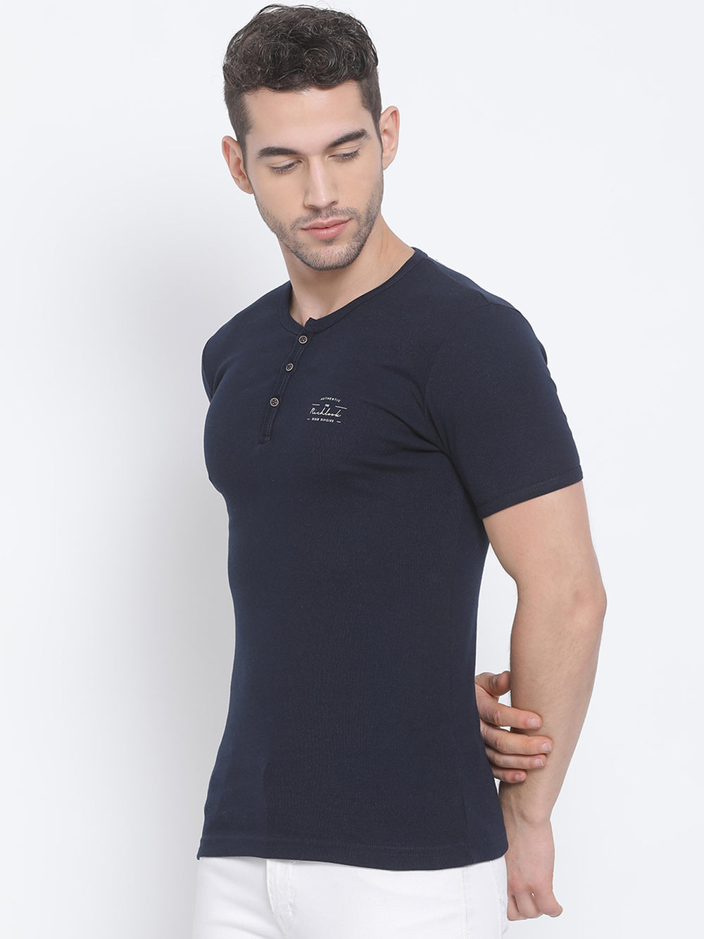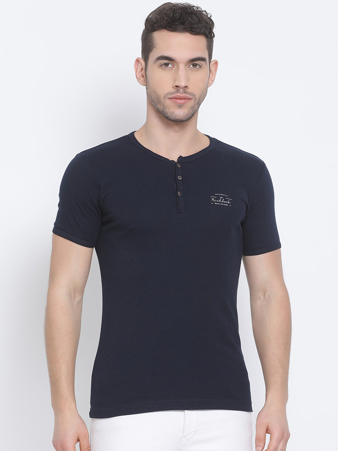 Men Navy Regular Fit Solid Henley Neck T-Shirt